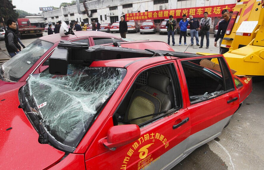 佛山市交通局的相关负责人表示,假出租车现在模仿得越来越像,普通市民很难分辨真假,如果要仔细观察,也就是真出租车车身相对较为干净,而假出租车由于都是买二手车、报废车改装的,相对比较破旧。交警人士表示,现在的假出租车基本上都是在深夜出来搭客,在一些城乡结合部的地方比较多。图为现场叉车正在摧毁非法出租车以及假牌匾。